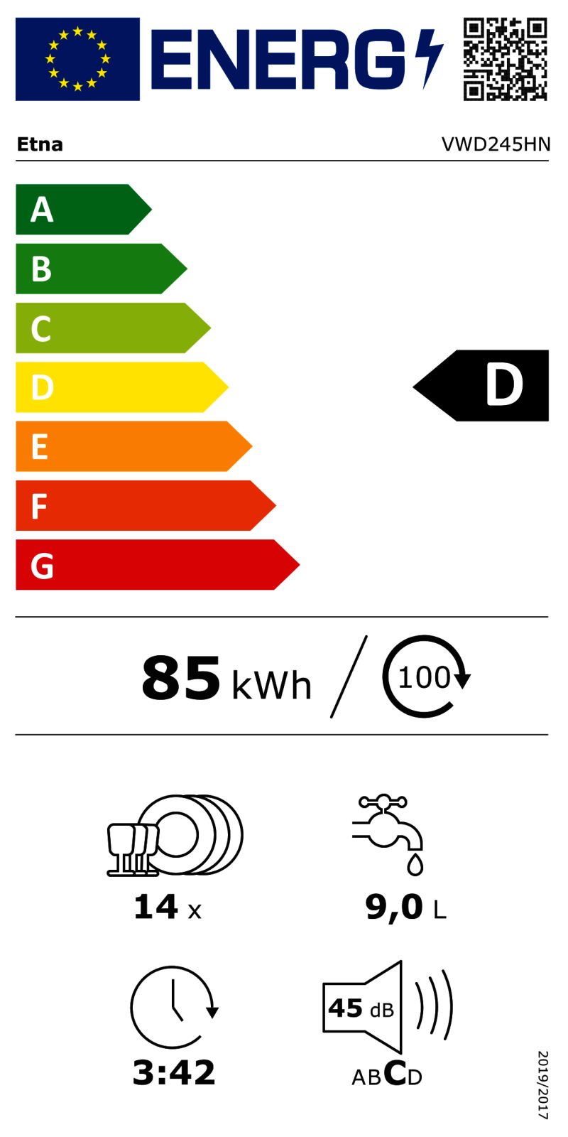 De VWD245HN heeft energieklasse D met 85 kWh per 100 cycli in eco. Het waterverbruik in het eco-programma is 9 liter per cyclus. De automatische deuropening verbetert het drogen en helpt energie besparen. Zo combineer je schoon resultaat met zuinig gebruik.